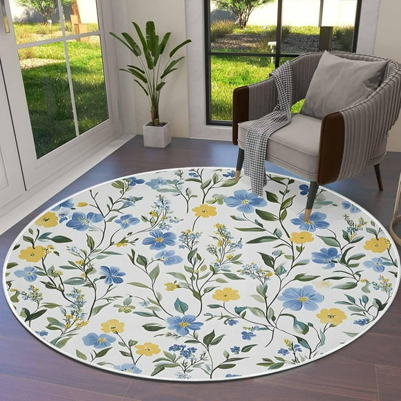 current price $102.25DecorLovee Blue Yellow Floral Spring Round Area Rugs 4ft - Soft Area Rug for Kids Room, Summer Botanical Pastoral Green Machine Washable Living Room Circle Rugs, Non-Shedding Bedroom Carpet Floor Mat