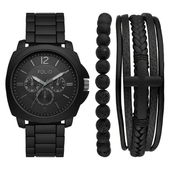 Folio Men's Matte Black Round Analog Bracelet Watch, Layered Bracelets and Black Multi-tool Gift Set (FMDAL1152) $18.98