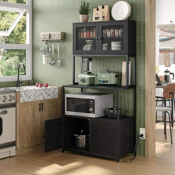 Furniouse 6-Tier Kitchen Bakers Rack with Power Outlet, Industrial Microwave Oven Stand with Shelves, Dust Prove Door, Standing Storage Rack (Black) $204.49