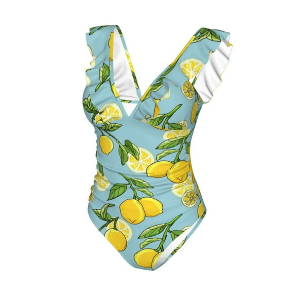 Goofa Lemon Print Women's Ruffled One Piece Swimsuit V Neck