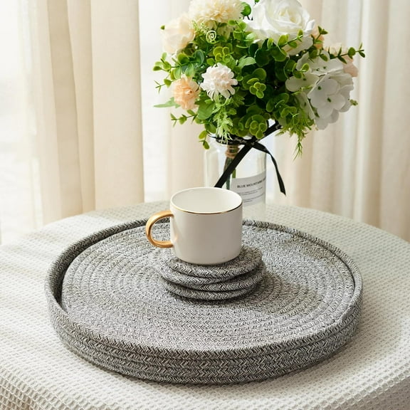 Woven Cotton Rope Round Placemats Set of 9 Pcs with Holder Included, Handmade Boho Kitchen Table Decor Woven Placemats & Coasters,Non-Slip and Heat Resistant 13" (Gray&White) $15.89