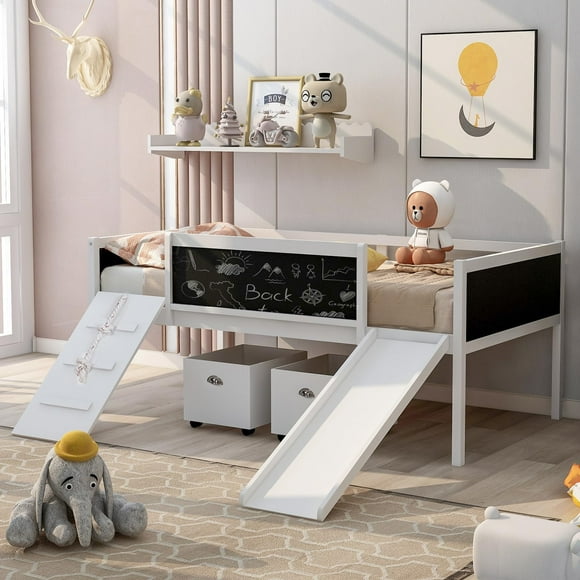 Jins & Vico Low Loft Bed with Slide, Rope and 2 Storage Boxes, White $187.89