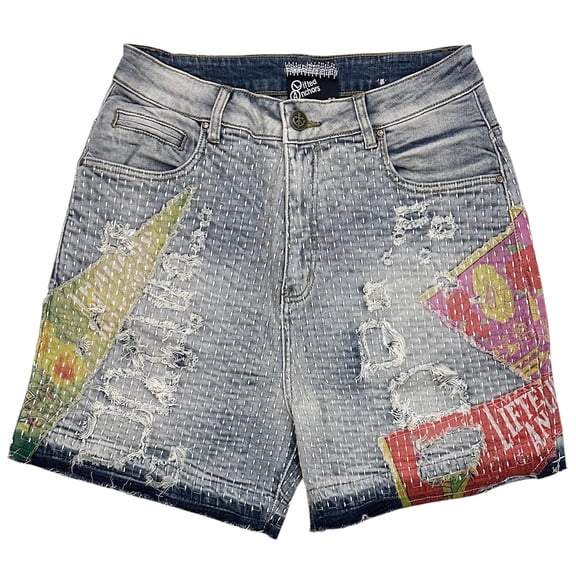 Lifted Anchors Men's Maria Boro Distressed Rip & Repair Patchwork Denim Shorts (34, Blue Bleached) $49.50