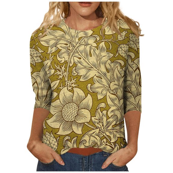 Biziza 3/4 Sleeve Blouses for Women Business Casual Elegant Polyester/Cotton Blended Fabric CrewNeck Blouses Tops (S-6XL)