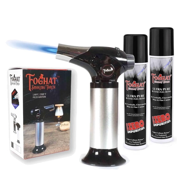 current price $92.38Foghat Kitchen Torch with Butane Included for Smoked Cocktails and Cooking - Handheld Refillable Culinary Butane Kitchen Blow Torches Food Lighter Gun, Creme Brulee Torch (TORCH + BUTANE 2x60ml SET)