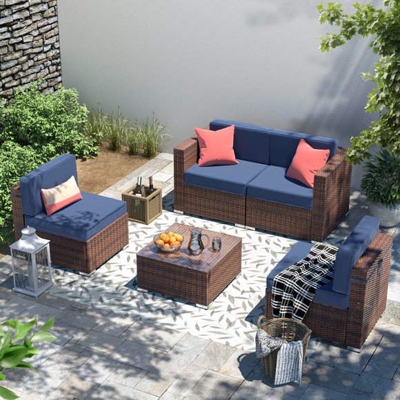 YOUDENOVA 5 Pieces Outdoor Sectional Sofa with Tea Table, PE Rattan Patio Furniture Sets,Navy Blue $754.62