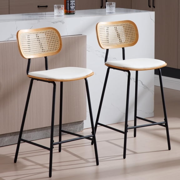 current price $160.84Mid-Century Bar Stools Set of 2, 26 Inch PU Leather Barstools with Open Rattan Backrest Metal Legs Armless Bar Chairs for Kitchen Island Dining Room, White