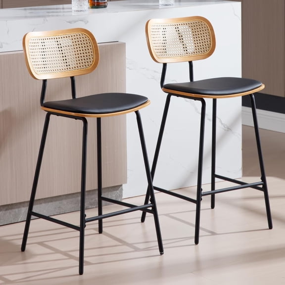 current price $163.99Mid-Century Bar Stools Set of 2, 26 Inch PU Leather Barstools with Metal Legs Open Rattan Backrest Bar Chairs for Kitchen Island Dining Room, Black