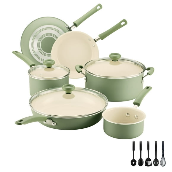 Farberware Easy Clean 14 Pcs Ceramic Nonstick Cookware Set with Cooking Tools, Dishwasher Safe, Green $77.00