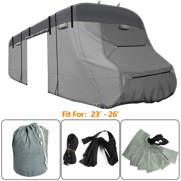 Oxford Fabric Class C RV Cover Fits 23'-26' Waterproof Rip-Resistant Anti-UV Motorhome Camper Cover for Winter Snow with Jack Cover 4 Tire Covers and Gutter Covers