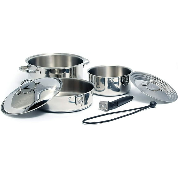 Camco Stainless Steel Nesting Cookware Set- Non Stick Pans and Pots with Removable Handles, Space Efficient Excellent for RVs and Compact Kitchen, 10-Piece Set (43921)
