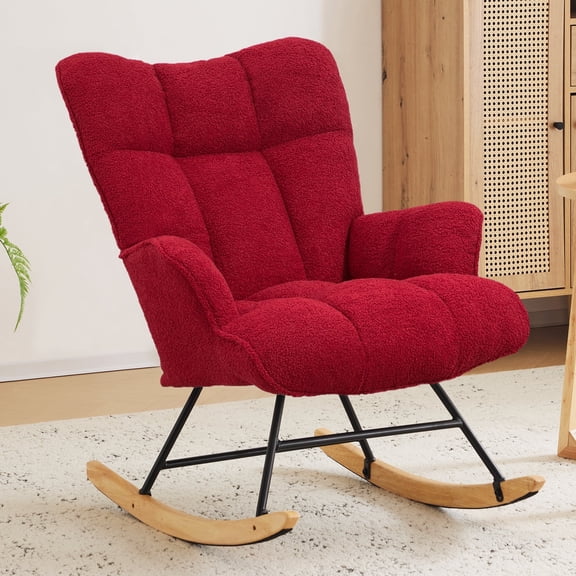 SAETSFEG Rocking Chair Nursery Teddy Upholstered Glider Rocker Rocking Accent Chair Padded Seat with High Backrest Armchair Comfy Side Chair for Living Room, Bedroom, Burgundy
