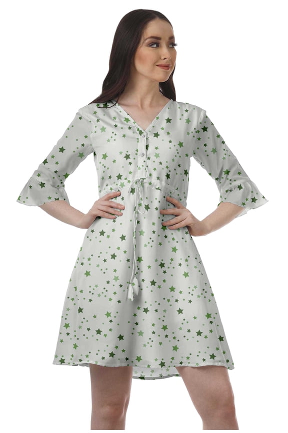 Drawstring Mini Dress Printed Poly Crepe Women Ruffle Sleeve Shirt Dress