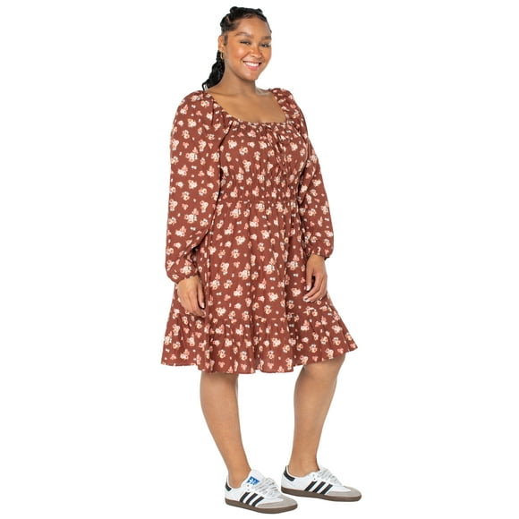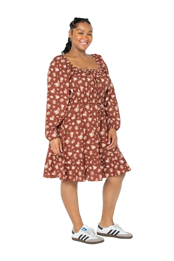 Women’s and Women’s Plus Floral Print Babydoll Dress with Long Sleeves, Sizes XS-4X