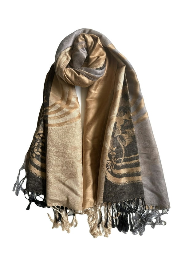 Tan Pashmina Shawl - Silver& Black Floral Swirl Patterns $14.95