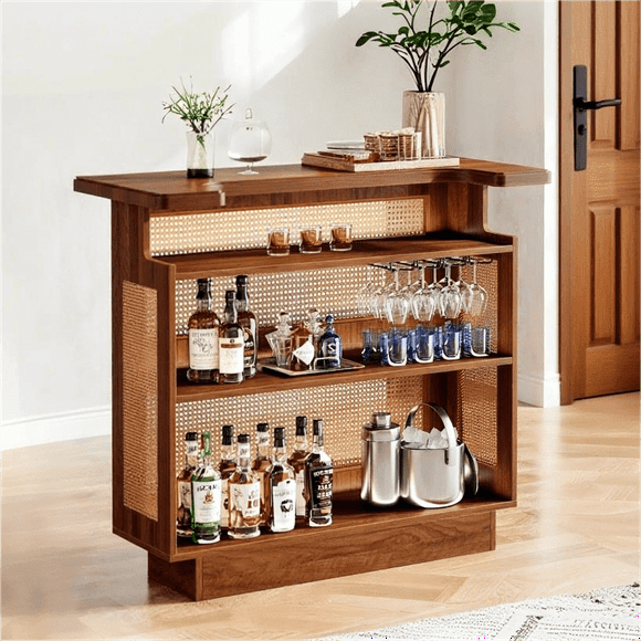 Fnova Rattan Home Bar Unit, Farmhouse 4-Tier Bar Table With 4 Stemware Racks, Heightened Base, Liquor Wine Bar Cabinet Mini Bar Table For Home Pub, Caramel Brown