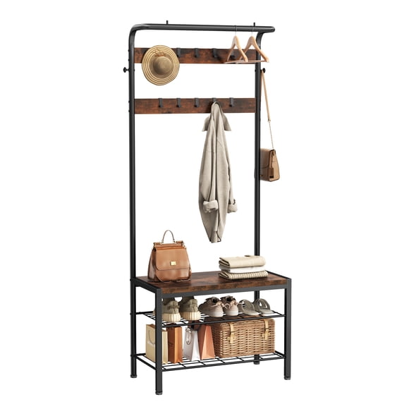 edx 4-in-1 Coat Rack with Shoe Bench, Sturdy Steel & Wood Entryway Organizer with 10 Removable Hooks, Anti-Tip Design, Rust Brown