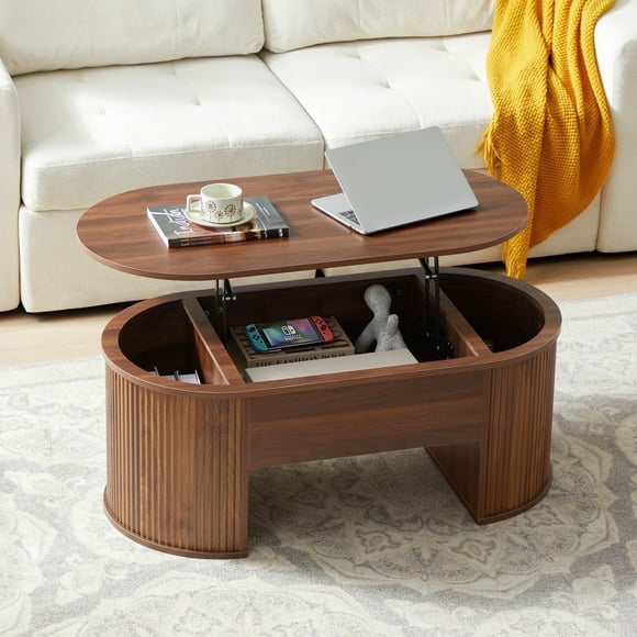 Wirrytor Lift Top Coffee Table with Storage and Open Storage Shelf, Oval Coffee Table for Living Room, Elliptical Arc Design, Fluted Center Table, Walnut Finish & Spacious Storage, $139.99