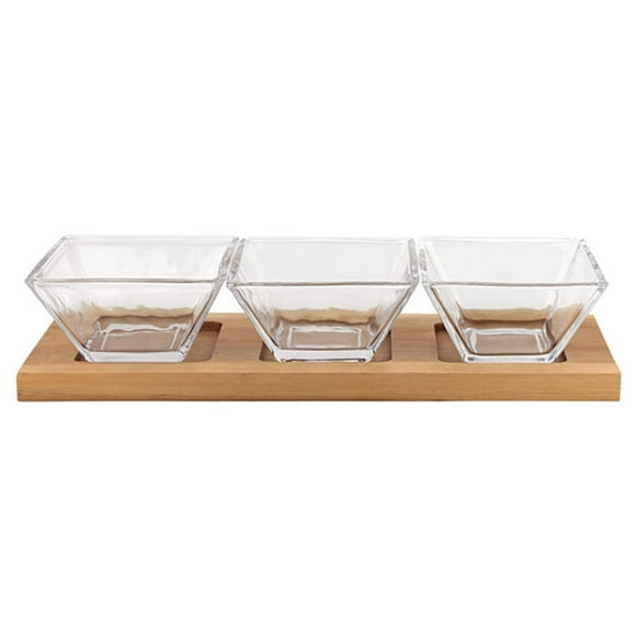 Elegant and Modern Decorative Hostess Set – 4 pc With 3 Glass Condiment or Dip Bowls on a Wood Tray, 12x2.5x4.5 Inches
