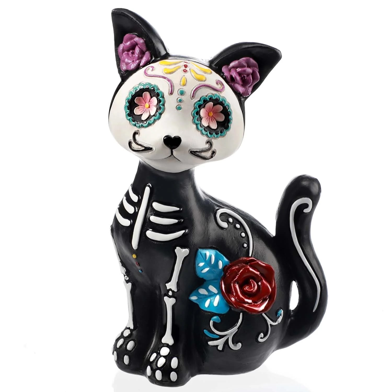 Ayieyill Halloween Cat Decor, Skeleton Cat Halloween Decorations Indoor, Day of the Dead Sugar Skull Decor, Dia de los Muertos Decor