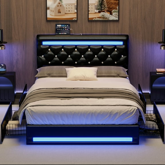 LIKIMIO Full Bed Frame with LED Light, PU Leather Platform Bed,Charging Station, 4 Storage Drawers,Adjustable Crystal Button Tufted Headboard, No Box Spring Needed, Black