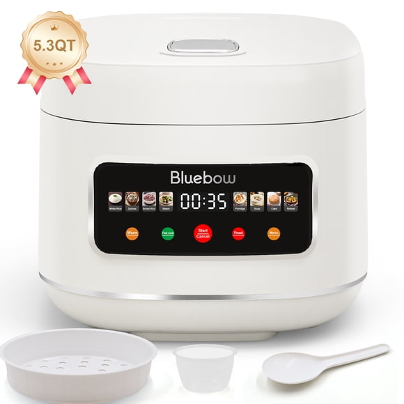 Bluebow Digital Rice Cooker, 5.3QT Rice Maker, 8-in-1 Smart Multi-Cooker, 24-Hour Timer & Keep Warm, Non-Stick Inner Pot, White