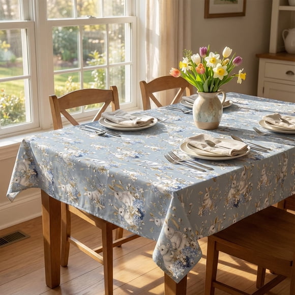 Sm:)e Hydrangea Bunny Easter Tablecloth - 60x84 Inch Polyester, Machine Washable & Reusable Table Cover for Indoor & Outdoor Use