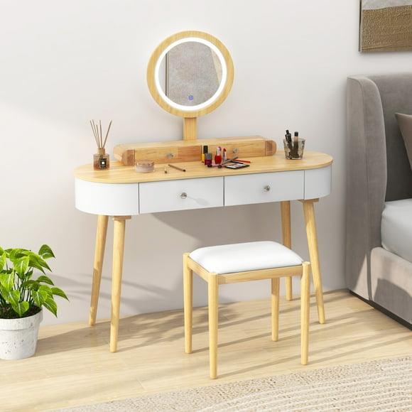 Costway Solid Wood Makeup Vanity Desk Set with LED Lighted Mirror Drawers Cushioned Stool White + Natural $149.99 Was $279.00