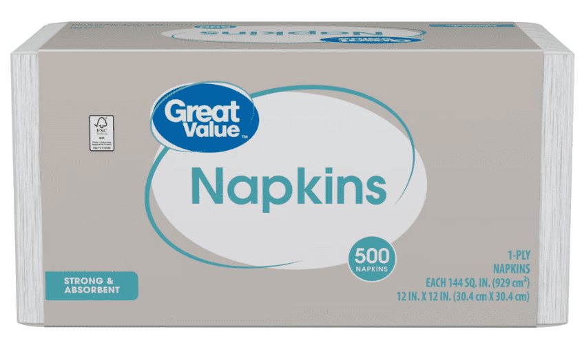In 50+ people's carts (3 pack) Great Value 12" x 12" Disposable Paper Napkins, White, 250 Count $6.78 90.4 ¢/100 ct