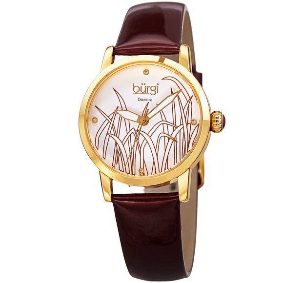 Women's Diamond Reed Design Dial Gold-Tone/Burgundy Leather Strap Watch