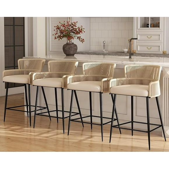Guyou Farmhouse Woven Bar stools Set of 4, 27 Inch Linen Upholstered Rattan Counter Height Bar Chairs, Modern Cane Kitchen Island Chairs with Curved Back for Dining Room Patio Garden, White $499.99