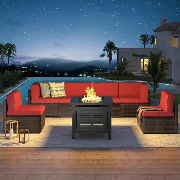 YODOLLA 7-Piece Patio Furniture Set with 30" Fire Pit Table, Rattan Wicker Outdoor Sectional Sofa Couch with Table Patio Conversation Set for Lawn& Backyard In Red $449.99 Was $709.99
