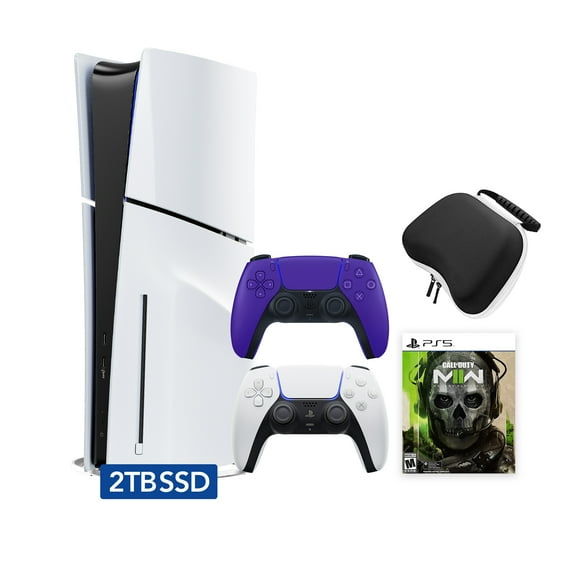 PlayStation 5 Slim Disc 2TB SSD Edition Call of Duty Modern Warfare II Bundle with Two Controllers White and Galactic Purple DualSense, Hard Shell Protective Controller Case - PS5 Gaming Console