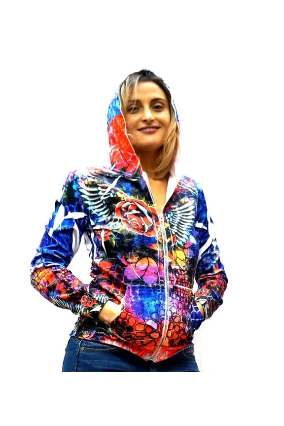 Sport Womens Jacket Long Sleeve Fleece Full Zip Tie Dye Hoodie Tattoo Pattern (D-18)
