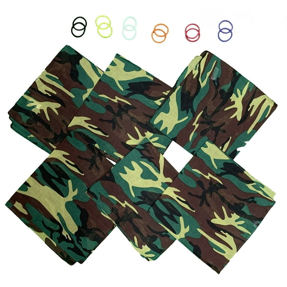DIY Face Mask Kit- 6 bandanas + 12 Pony Tail Holders - Make 6 Masks (Camo)