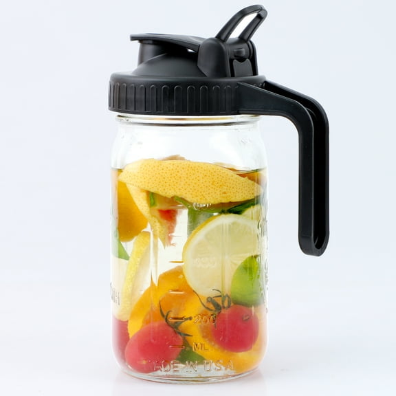 current price $12.99Wide Mouth Mason Jar pitcher With Pour Spout Handle Lids, 32 OZ Wide Mouth Leaking Proof 1 Quart Glass Pitchers Canning Jar With Flip Cap Heavy Duty