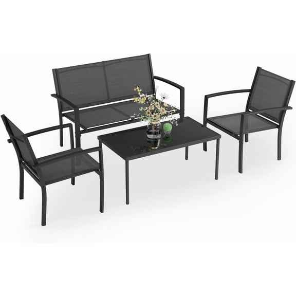 Greesum 4 Pieces Patio Furniture Set, Outdoor Conversation Sets for Patio, Lawn, Garden, Poolside with A Glass Coffee Table, Black