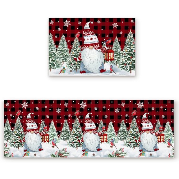 LooPoP Christmas Tree Gnome Kitchen Mats for Floor Cushioned Anti Fatigue 2 Piece Set Kitchen Runner Rugs Non Skid Washable Snowflakes Robin Berries