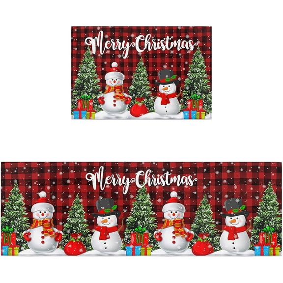 LooPoP Christmas Winter Snowman Tree Gift Kitchen Mats for Floor Cushioned Anti Fatigue 2 Piece Set Kitchen Runner Rugs Non Skid Washable Snowflake Red Plaid Merry