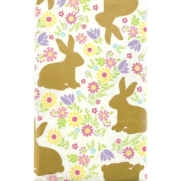 Easter Bunny Vinyl Tablecloth, Spring Welcome Country Gold Silhouette Rabbit with Colorful Flowers - Flannel Backed Vinyl Tablecloth, 52" x 90" Inch Rectangle