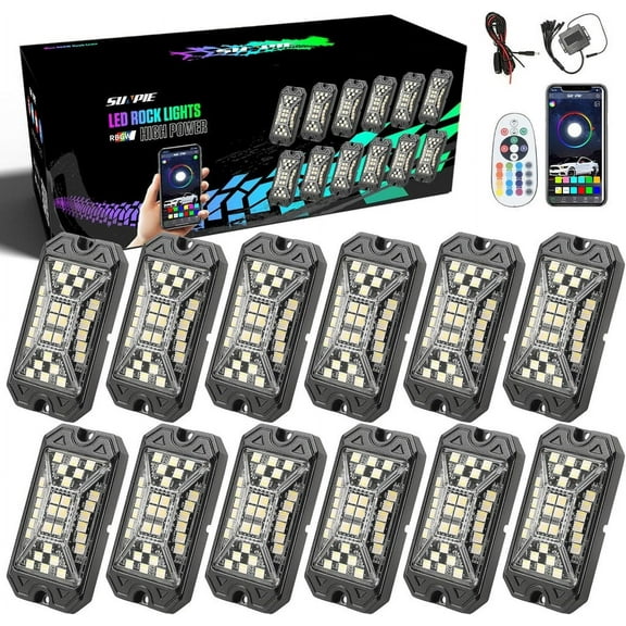 SUNPIE 12Pcs High Power Wide Angle RGBW LED Rock Lights Full Luminous Zone with Phone App Remote Control Voice Mode Music Mode Neon Accent Wheel Well Lights for Off Road Truck SUV ATV UTV Bo $86.16
