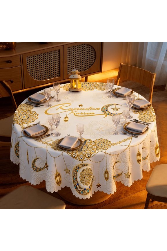 60 Inch Round Ramadan Tablecloth, White with Gold "Ramadan Kareem" Calligraphy, Crescent Moon and Lantern Pattern, Decorative Fringe, Eid Iftar Dinner Decor 24 out of 5 Stars. 2 reviews