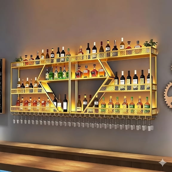 Pikysailed 59in Modern Wall Mounted Wine Rack w/ LED Light, Metal Bar Shelves Wall Mounted w/ Glass Holder, Large Liquor Shelf for Liquor Bottles for Kitchen & Dining Room $389.99