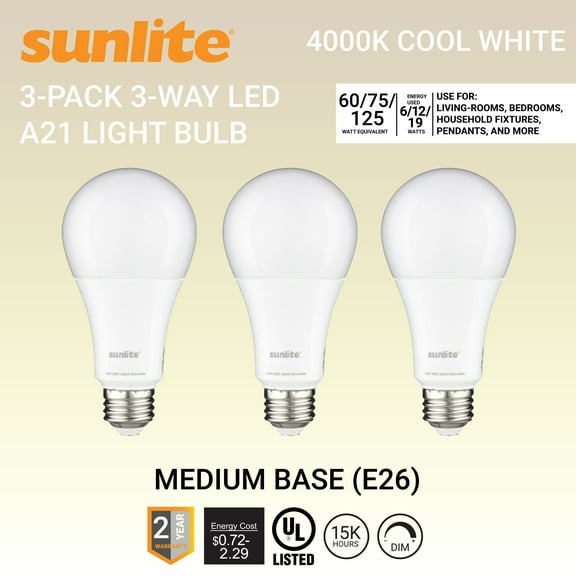 current price $36.96Sunlite 3-Way LED A21 Light Bulb, 6/12/19 Watts (60W 75W 125W Equivalent), Medium E26 Base, Dimmable,UL Listed, 4000K Cool White, 3-Pack