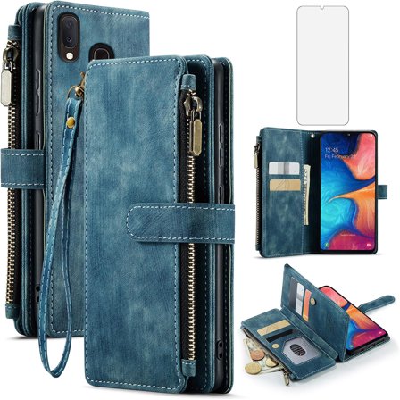 Asuwish Compatible with Samsung Galaxy A20e Wallet Phone Case and Tempered Glass Screen Protector Faux Leather Flip Credit Card Holder Stand Zipper Slot Folio Cell Cover for A 20e 20ae Women Blue From $19.99