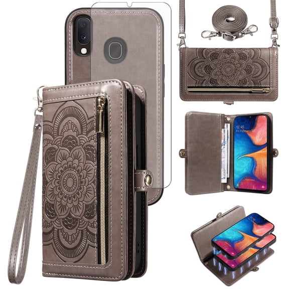 Asuwish Phone Case for Samsung Galaxy A20e Zipper Wallet Detachable Cell Cover with Tempered Glass Screen Protector Crossbody Lanyard Strap Flower Flip Card Holder Slot A 20e 20ae Women Girls Gray From $25.99
