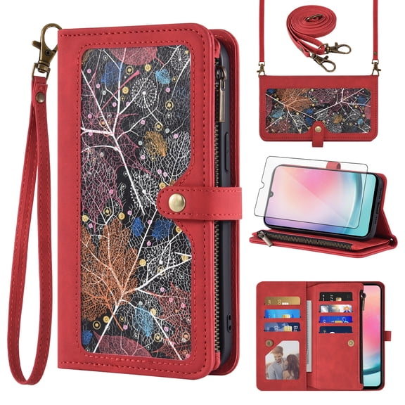 Asuwish Phone Case for Samsung Galaxy A24 4G/5G Wallet Cover With Tempered Glass Screen Protector Crossbody Wrist Strap Flip Pattern Zipper Credit Card Holder Stand Cell A 24 24A Lte Women Men Red From $21.99