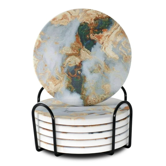 6 Pcs White Marble Ceramic Coasters With Holder Absorbent Drink Coaster Set Outdoor Round Abstract Gold Housewarming Gifts Cute Table Decorative Coffee Cup Beverage Fun Wine Beer Bar From $14.99