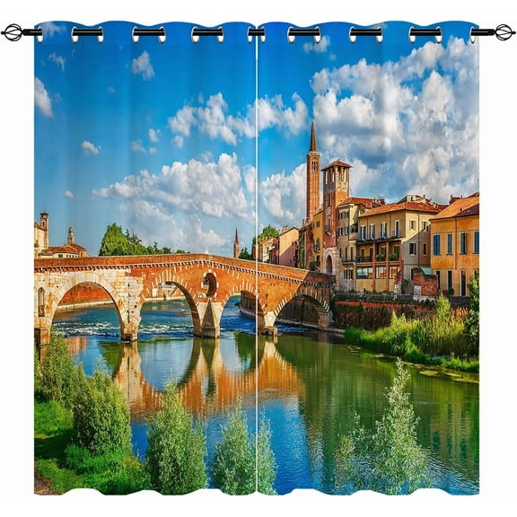 European Shower Curtain, Verona Italy During Summer Sunset Blue Hour Adige River Medieval Historcal, Cloth Fabric Bathroom Decor Set with Hooks,Aqua Coral Green
