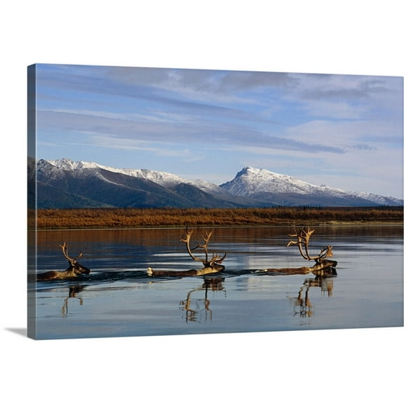 Great BIG Canvas | "Caribou Herd Swimming Across Kobuk River, Arctic Alaska" Canvas Wall Art - 24x16
